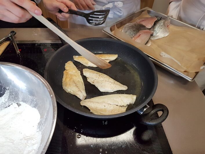 Spaß hatten wir bei diesem Kochkurs reichlich. Und gute Informationen gab es noch dazu. Wusstest du zum Beispiel, dass du Fischfilets vor dem Braten nicht unter Wasser abbrausen solltest? Die Lamellen würden sich dann nur mit Wasser voll saugen und den Fisch wässrig schmecken lassen. Anders sieht das aus, wenn du einen ganzen Fisch verarbeiten willst. Denn dann kommt es darauf an, mögliche Reste von Schleim von der Haut zu entfernen. Ich würde sagen, mit diesen und vielen weiteren Kochtipps kann dann künftig auch zu Hause nichts mehr schief gehen.