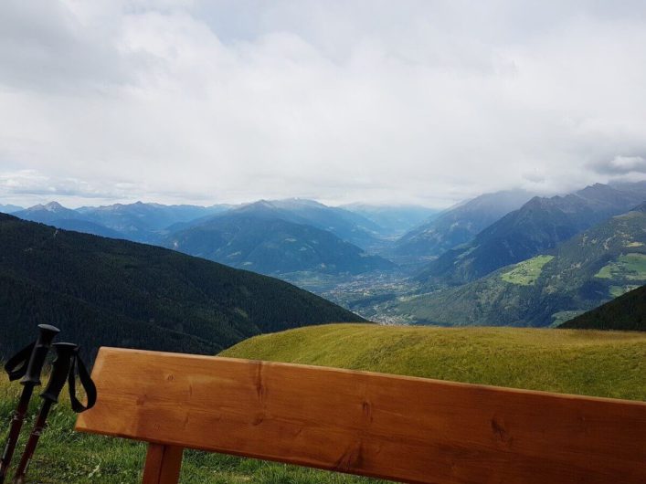 Nach unserer Pause machten wir uns an den weiteren Abstieg in Richtung Schenna. Dafür wählten wir den direkten – aber scheinbar endlosen – Weg über die Forststraße zum Gasthof Pichler an der Talstation der Taser-Bahn und von dort weiter zu Fuß ins Dorf. Insgesamt hatten wir damit beim Abstieg etwa 1400 Höhenmeter bewältigt. Alternativ bieten sich aber zwei weitere Möglichkeiten für den Rückweg an – vor allem, wenn du dein Auto morgens in Verdins an der Seilbahn geparkt hast. Die erste davon ist außerdem die mit Abstand kniefreundlichste Methode für den Abschluss der Wanderung zur Assenhütte. Entweder gehst du dafür von Videgg aus über die Forststraße nach Oberkirn und nimmst von dort die Seilbahn nach Verdins. Oder du steigst von Videgg aus über den steilen Wiesenweg zu Fuß nach Verdins ab.